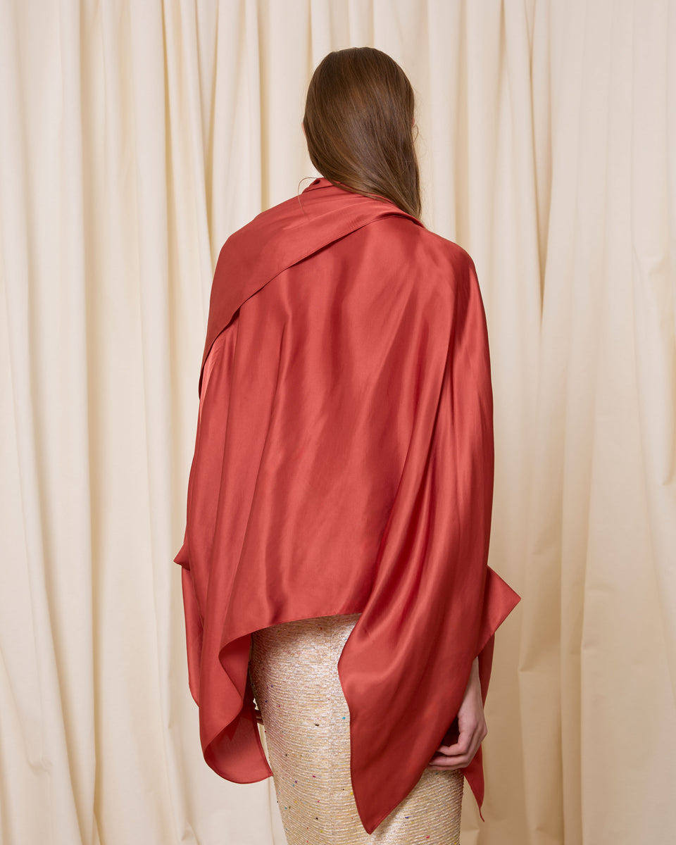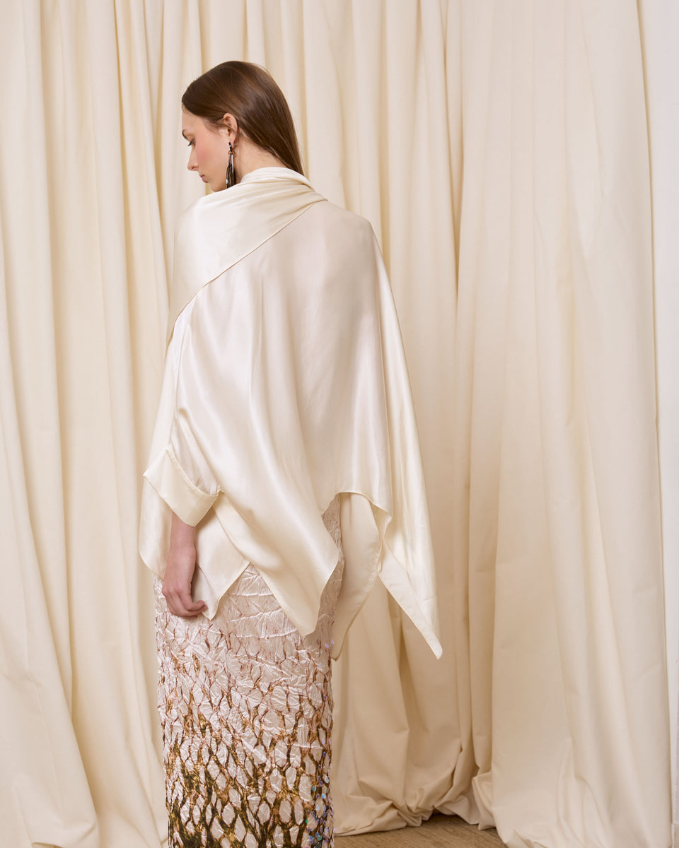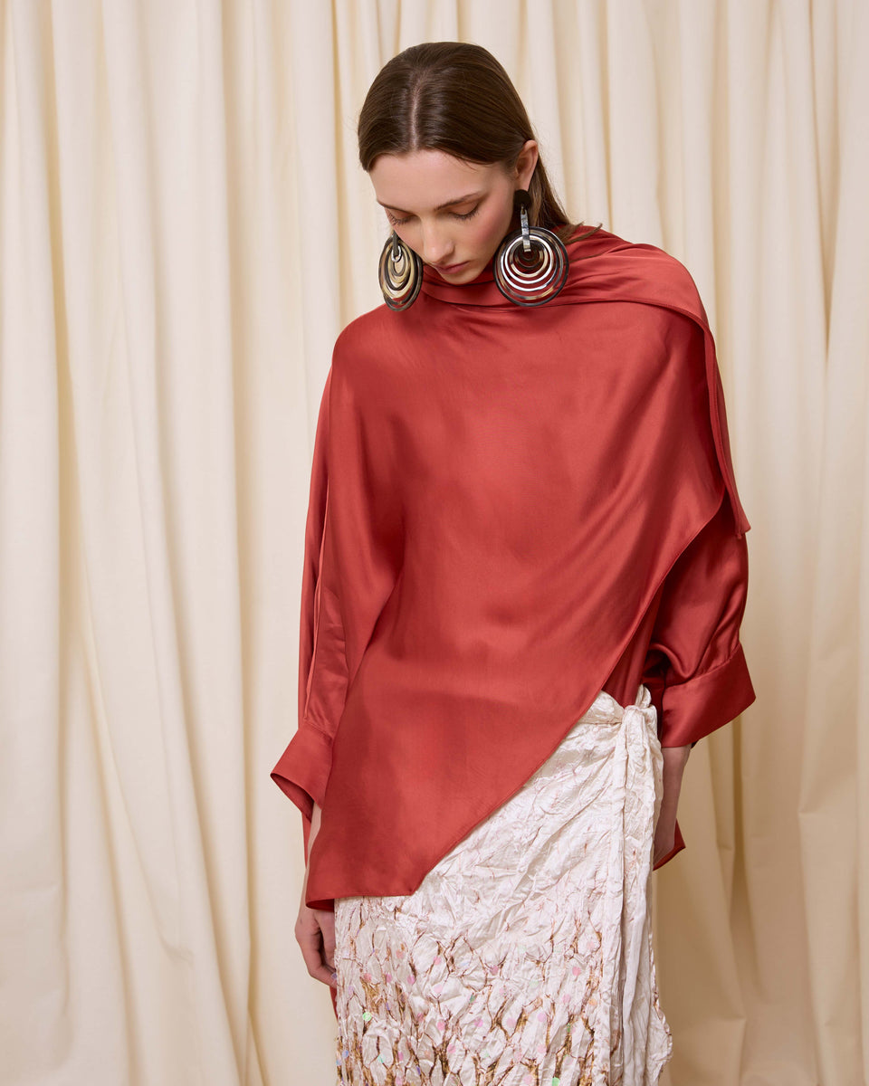 DESCRIPCIÓN: Blusa satinada en tejido 100% viscosa con una capa para llevar cruzada. Corte asimétrico. COMPOSICIÓN: 100% Viscosa