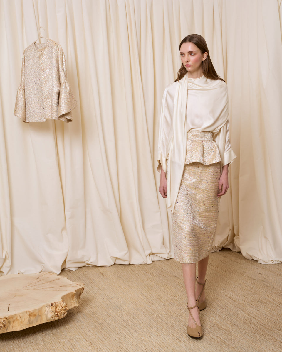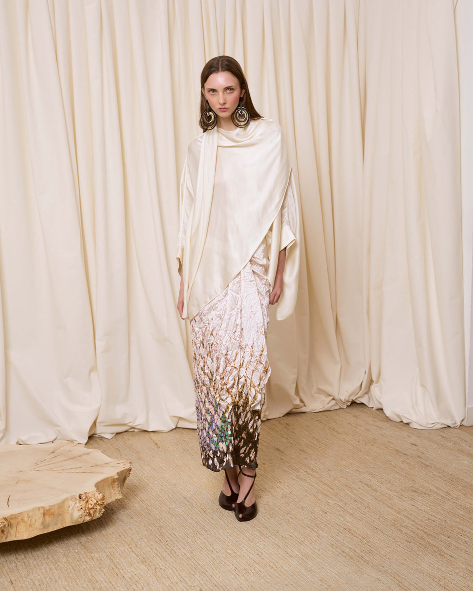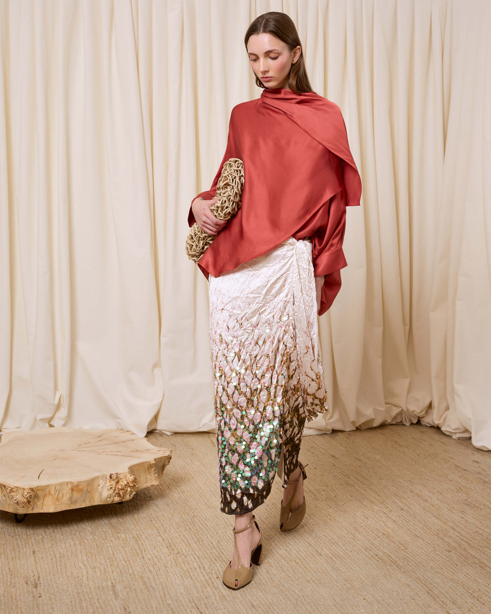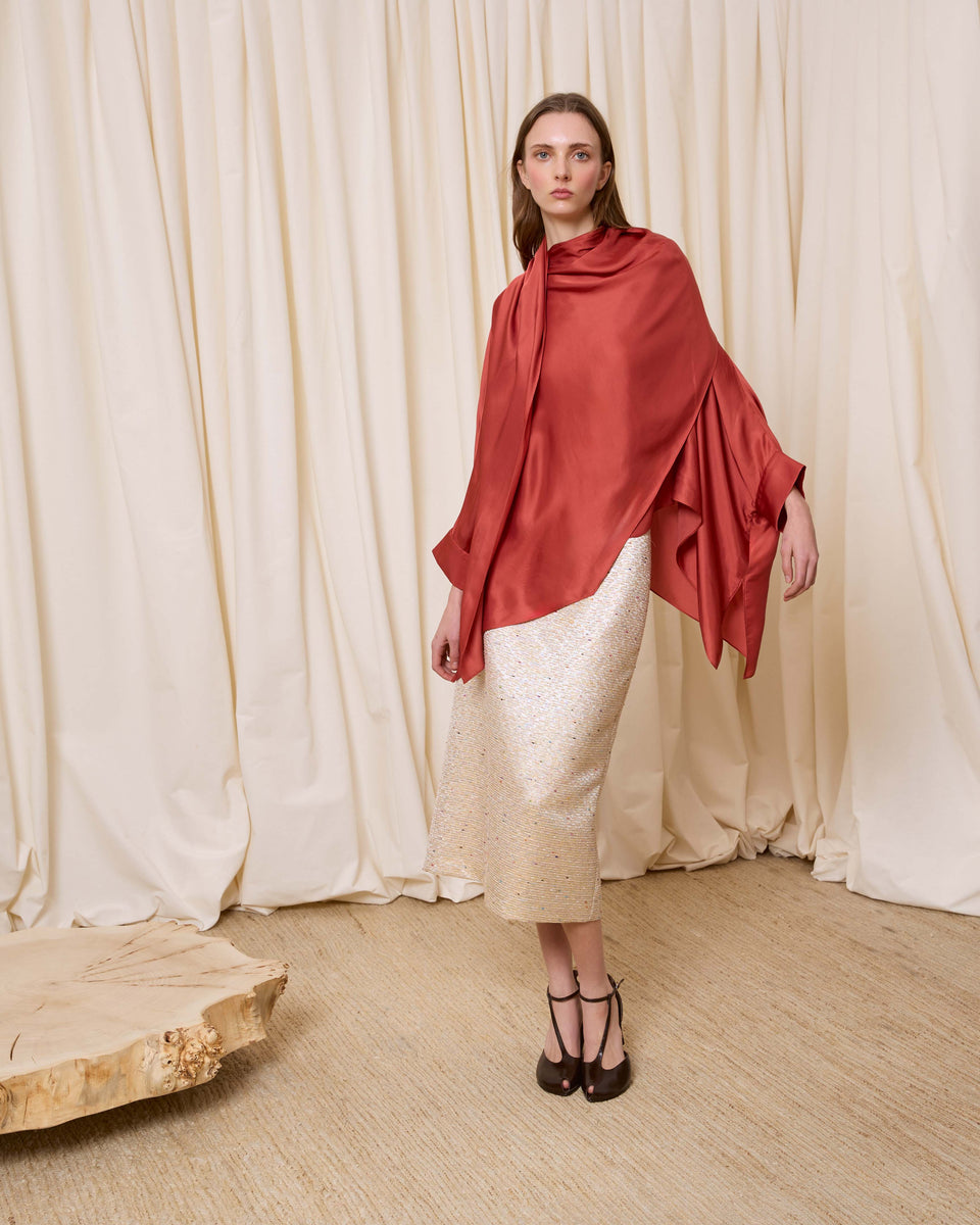 DESCRIPCIÓN: Blusa satinada en tejido 100% viscosa con una capa para llevar cruzada. Corte asimétrico. COMPOSICIÓN: 100% Viscosa
