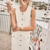 DESCRIPCIÓN: Diseñado con líneas limpias y textura agradable al tacto, este chaleco de bouclé presenta escote redondo y corte sin mangas. Los botones dorados en la parte delantera añaden un acabado refinado y llamativo. Tejido de bouclé. Escote redondo. Ribete de botones dorados en la parte delantera. Sin mangas. Con forro