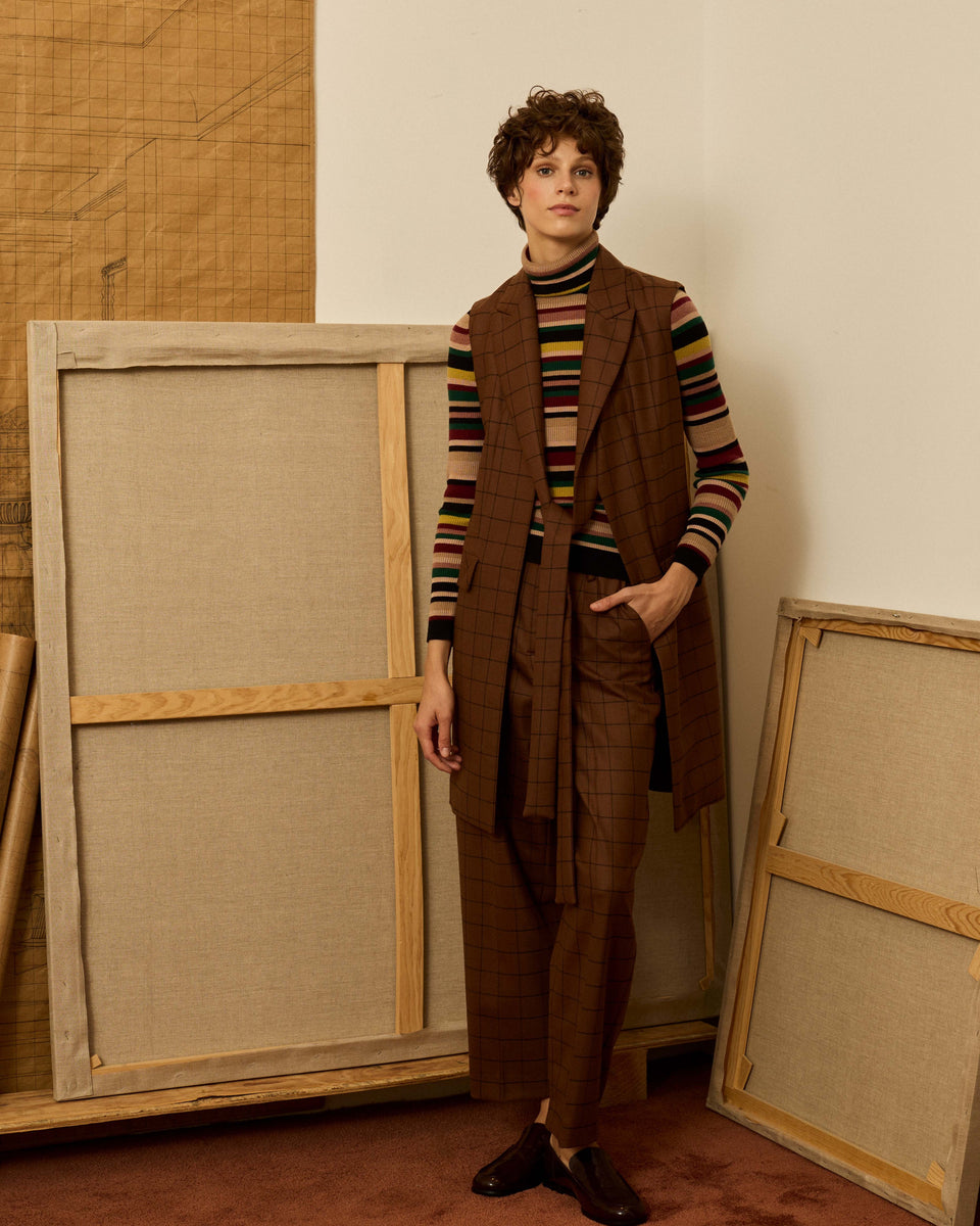 Chaleco en tejido estampado de cuadros ventana sin mangas con solapa. De largura media, con bolsillos de solapa y con detalle de mismo tejido de lazada para abrochar.