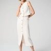 DESCRIPCIÓN: La textura clásica se une a un acabado moderno en esta falda de bouclé. Diseñada con una silueta recta, presenta un dobladillo dividido, solapas falsas en los bolsillos y un ribete de botones dorados que aportan un detalle extra. Tejido de bouclé. Cremallera lateral. Ribete de botones dorados y solapas falsas en bolsillos.