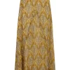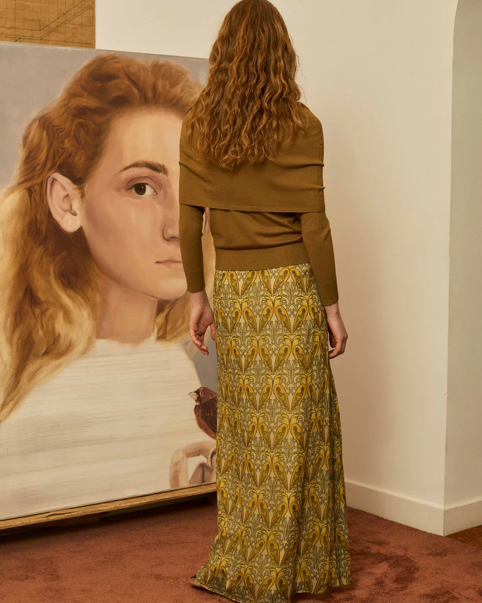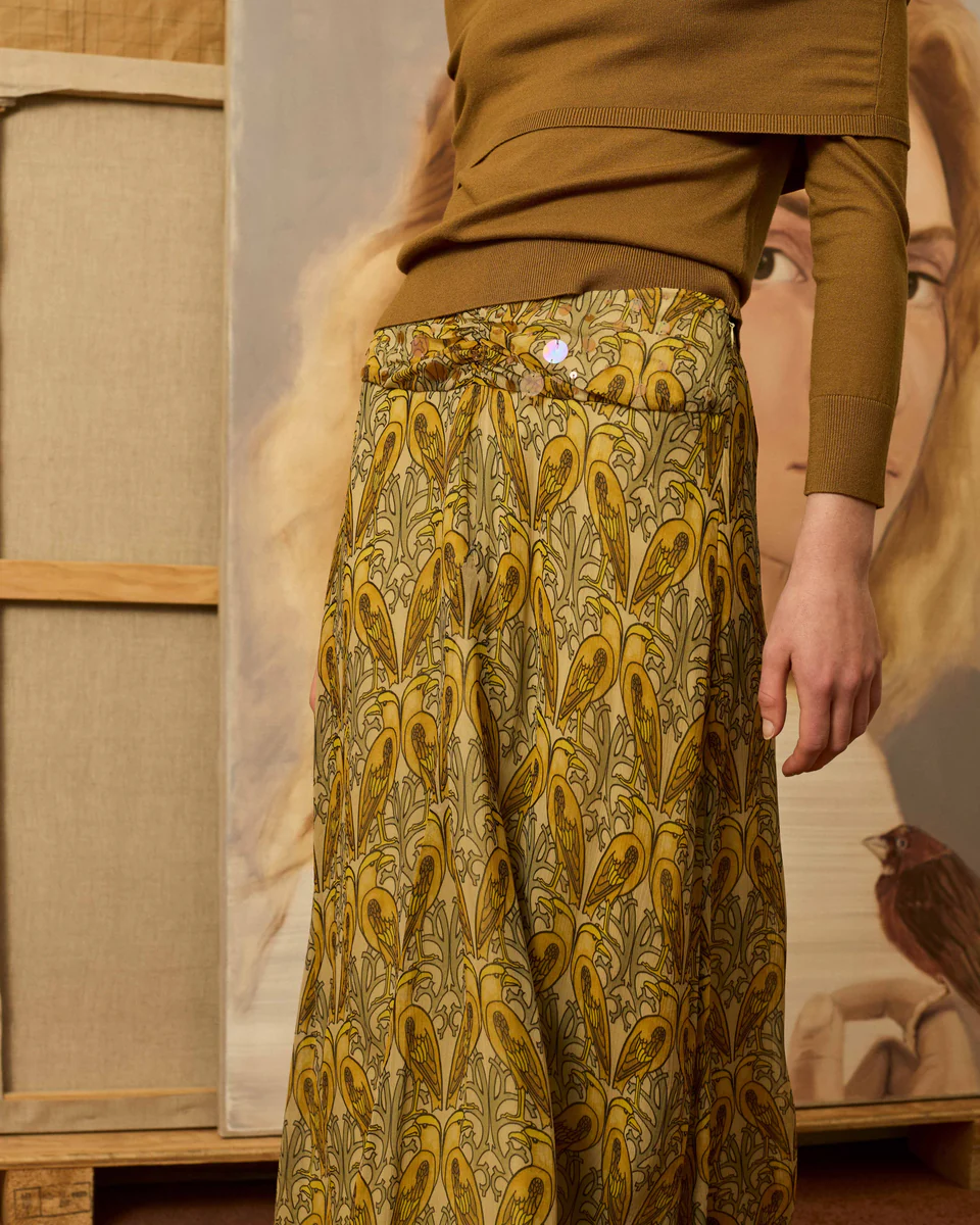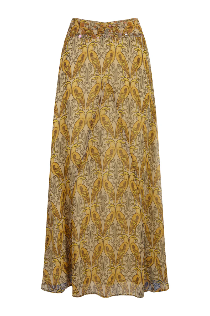 Falda de crinkle de viscosa con estampado estilo art nouveau de pájaros en tonos amarillos. Tiene en la cintura detalle de lentejuelas semitransparentes y en el frontal un frunce sutil.