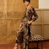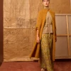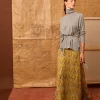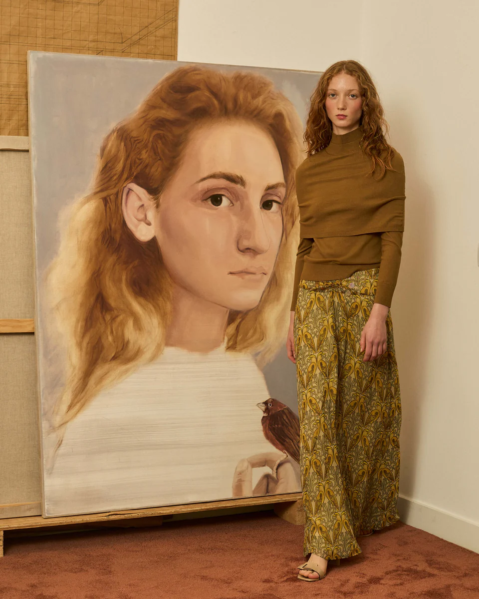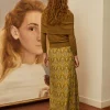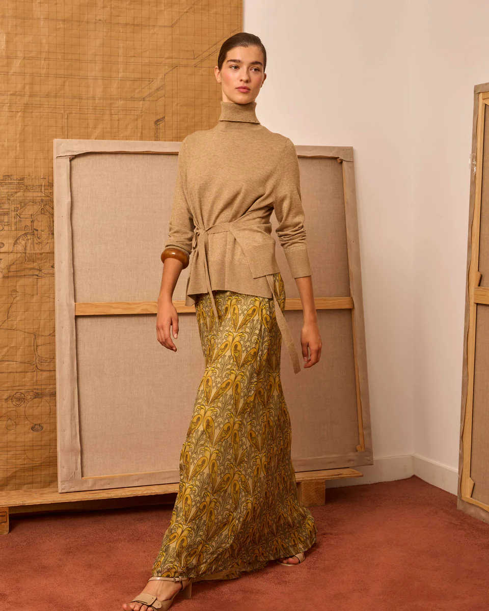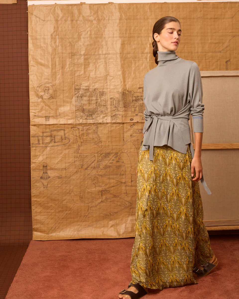 Falda de crinkle de viscosa con estampado estilo art nouveau de pájaros en tonos amarillos. Tiene en la cintura detalle de lentejuelas semitransparentes y en el frontal un frunce sutil.