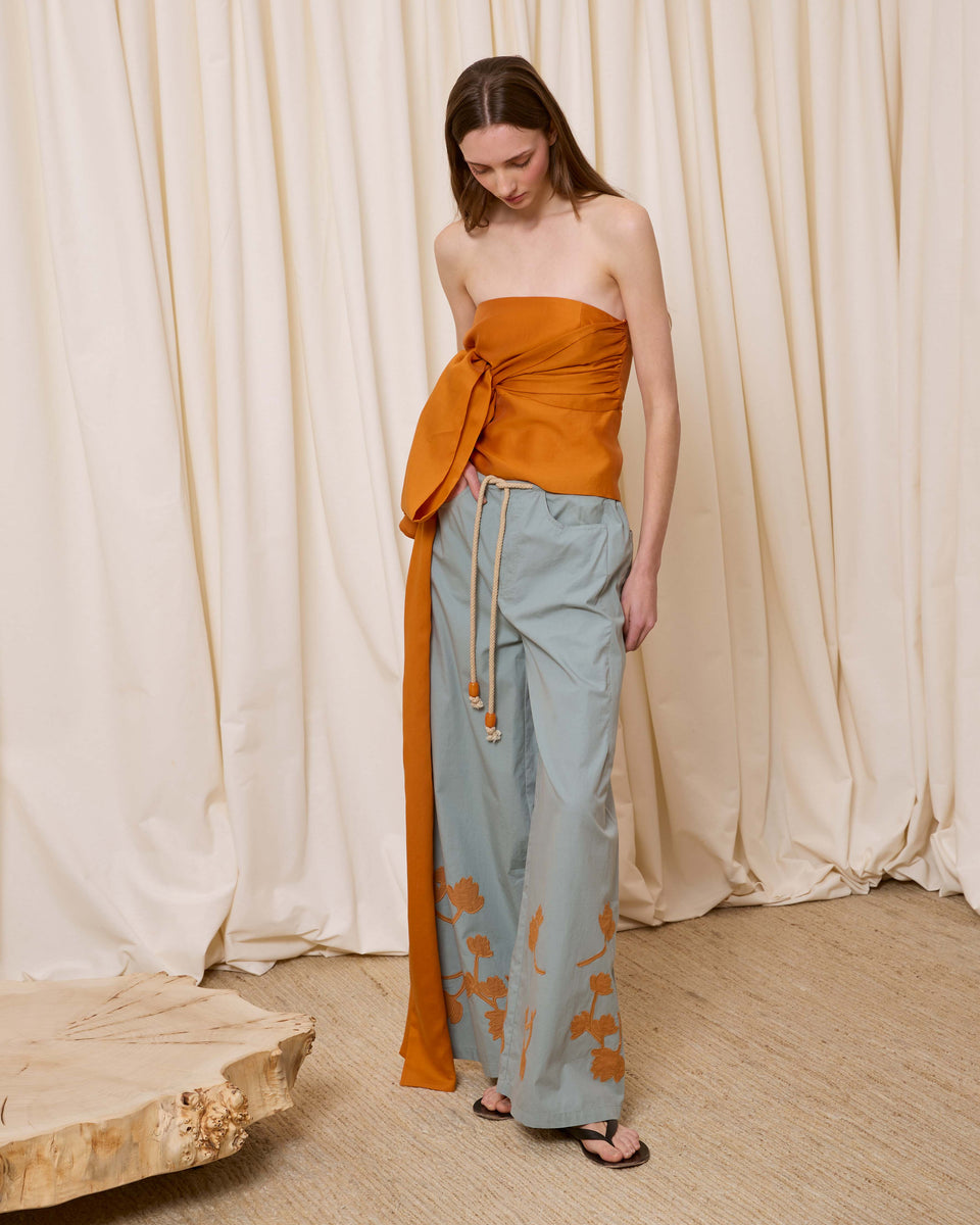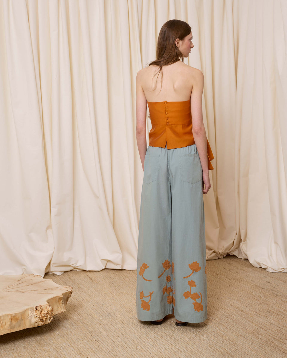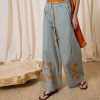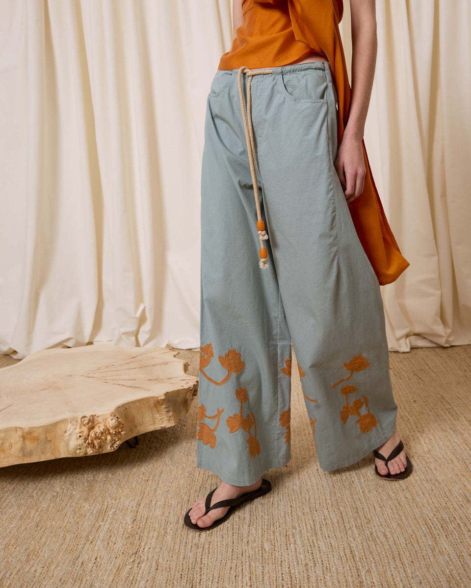 DESCRIPCIÓN: Pantalón amplio de popelín en color azul, con flores recortadas en algodón y cosidas en el bajo en tono ocre. Cinturilla con cuerda gruesa para ajustar el contorno. COMPOSICIÓN: 100% Algodón