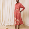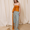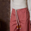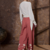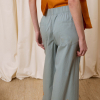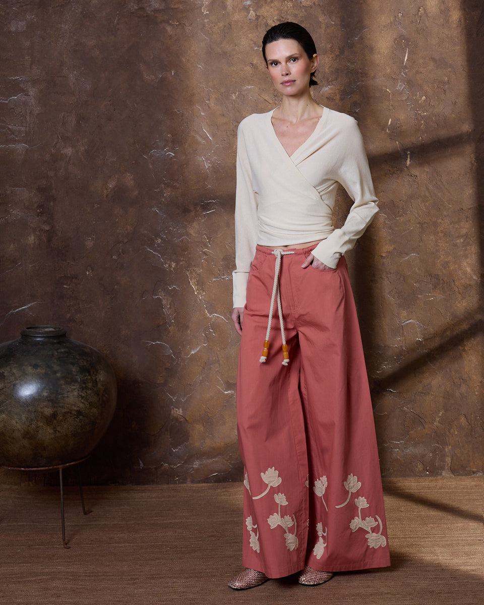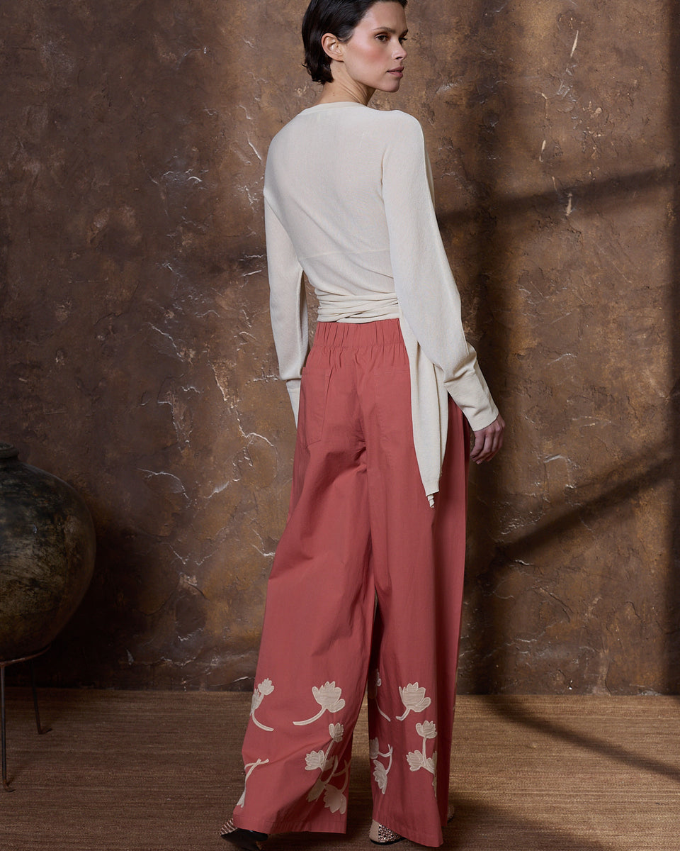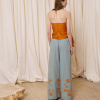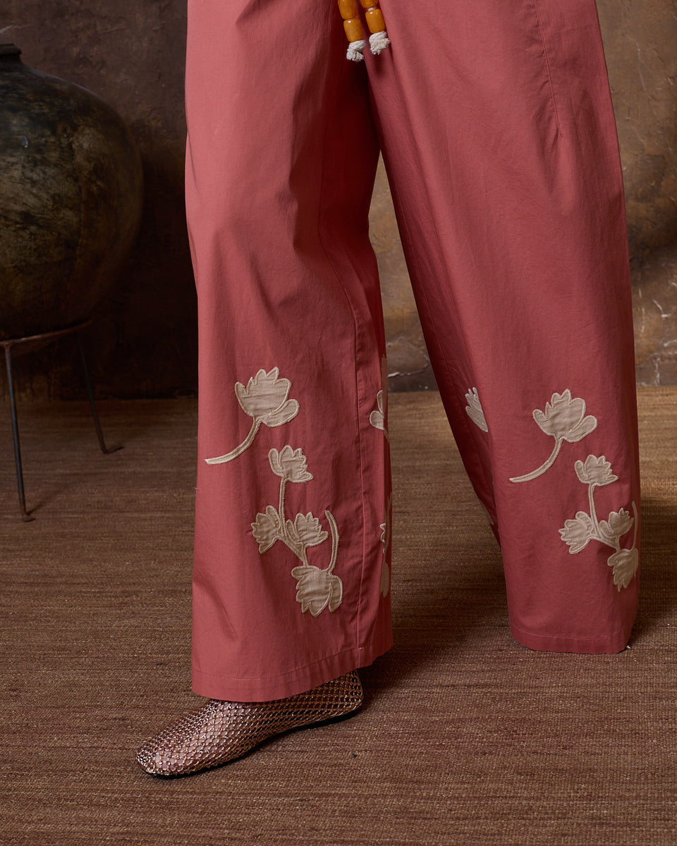 DESCRIPCIÓN: Pantalón amplio de popelín en color azul, con flores recortadas en algodón y cosidas en el bajo en tono ocre. Cinturilla con cuerda gruesa para ajustar el contorno. COMPOSICIÓN: 100% Algodón