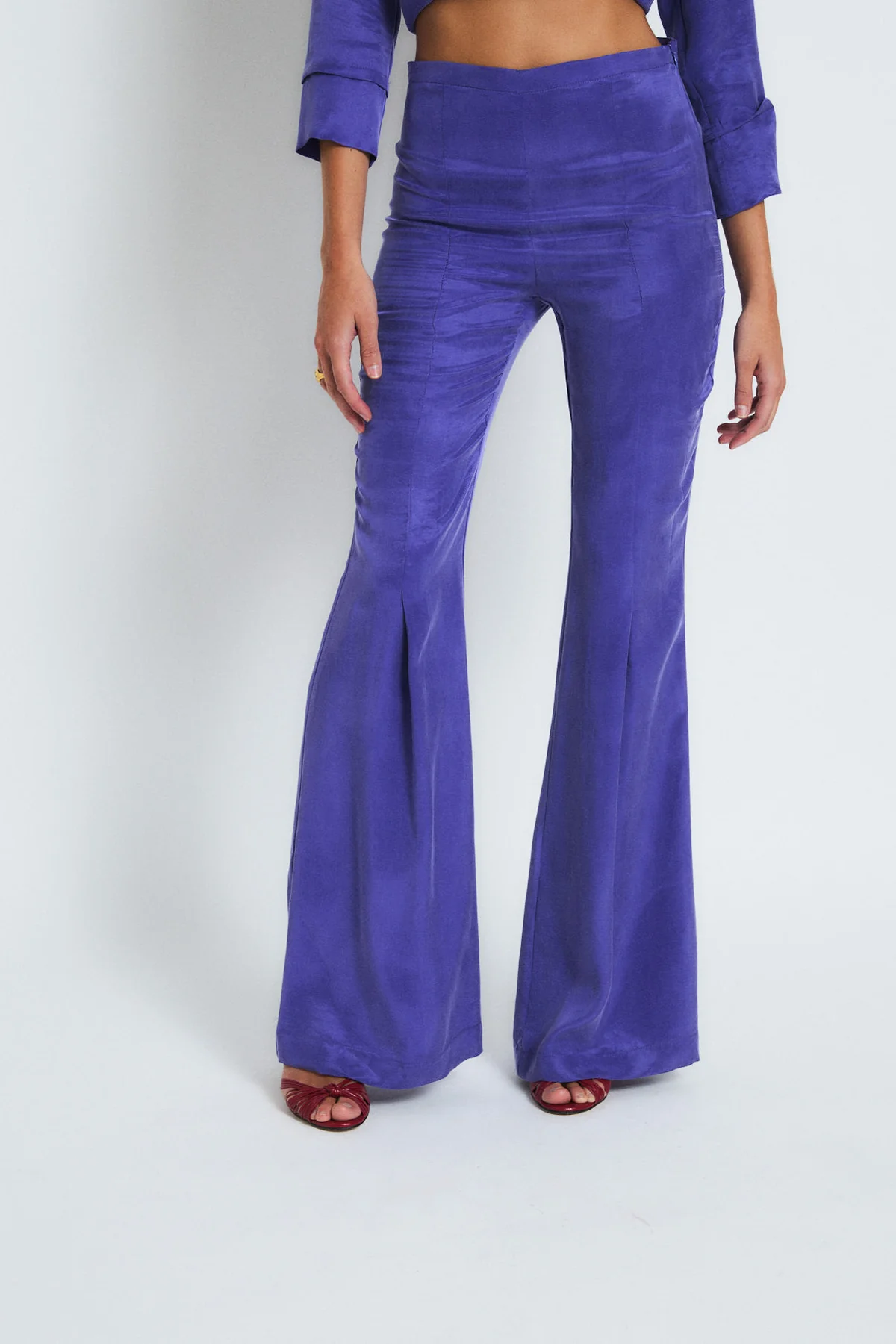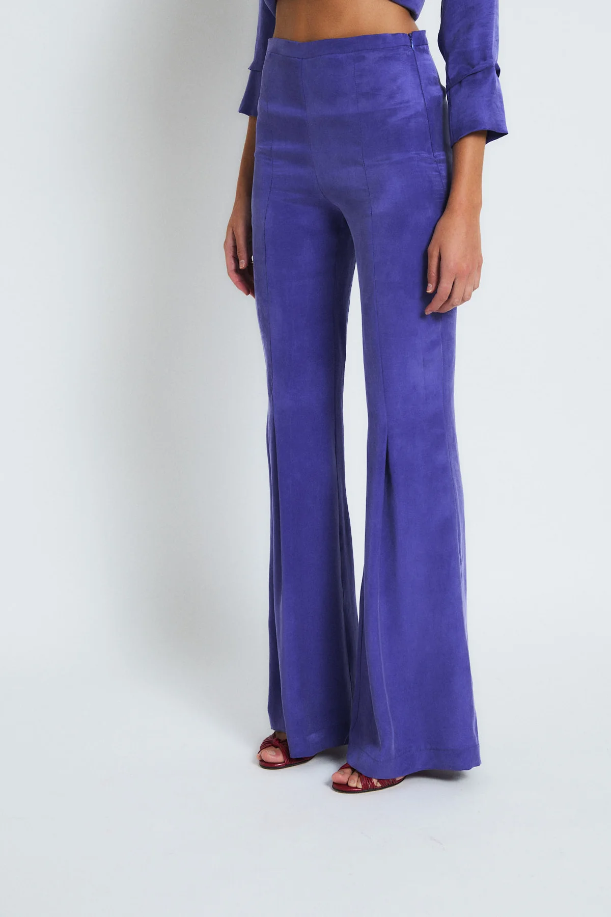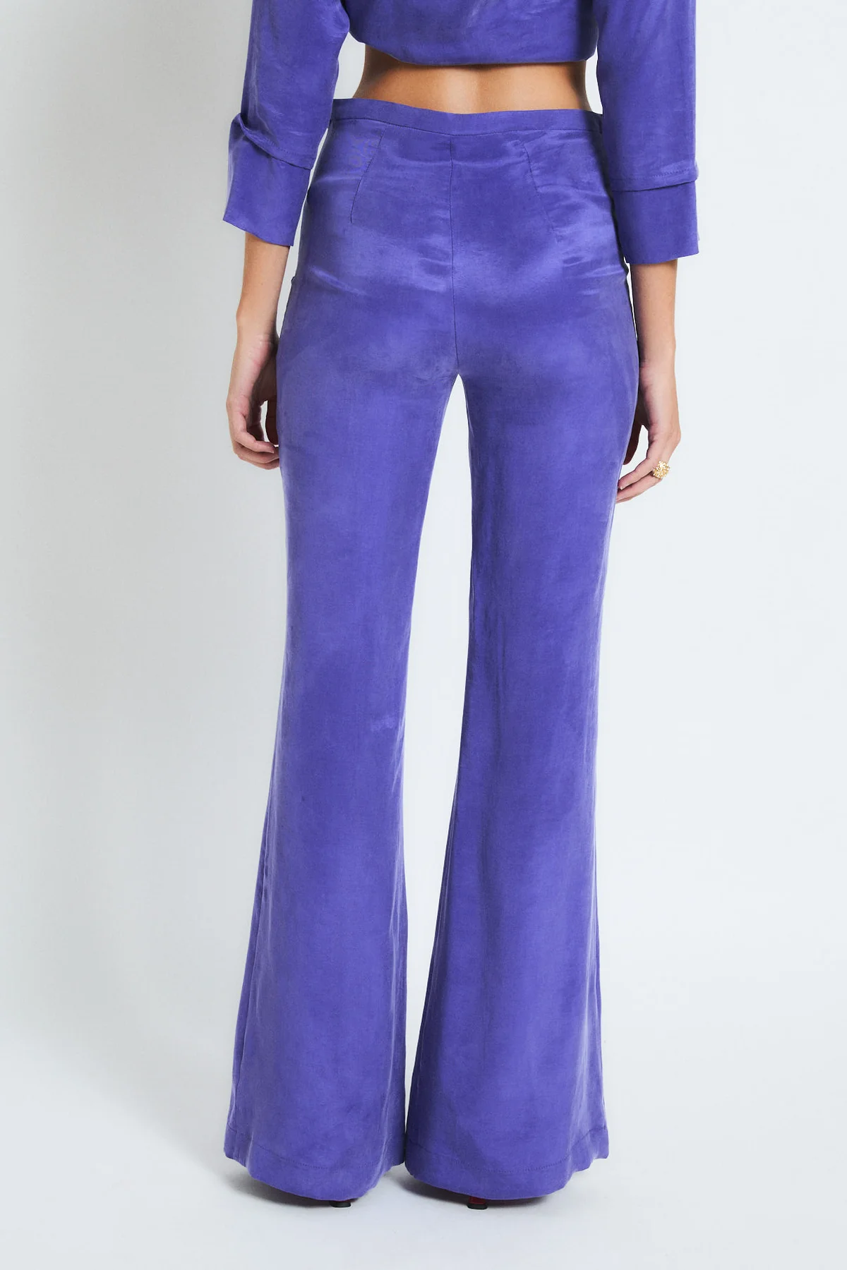 Pantalón color morado de tiro alto, ajustado en la parte superior y con bajo acampanado. De tejido 100% cupro y caída fluida, estiliza y alarga la silueta.