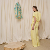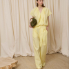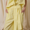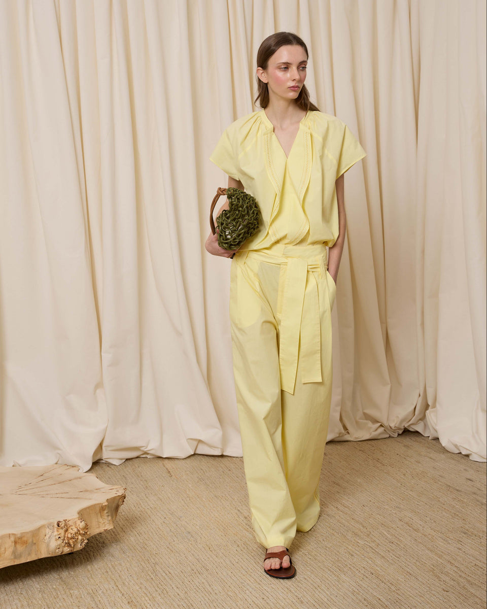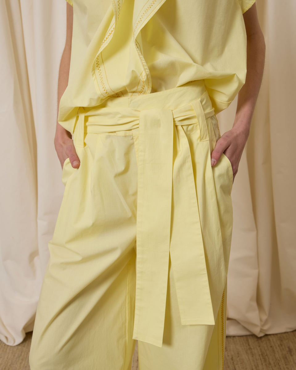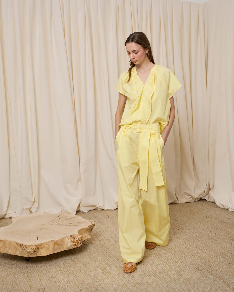 DESCRIPCIÓN: Pantalón de pinzas amplio en popelín de algodón amarillo mantequilla. Con bolsillos y cinturón a juego. COMPOSICIÓN: 100% Algodón