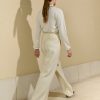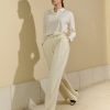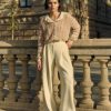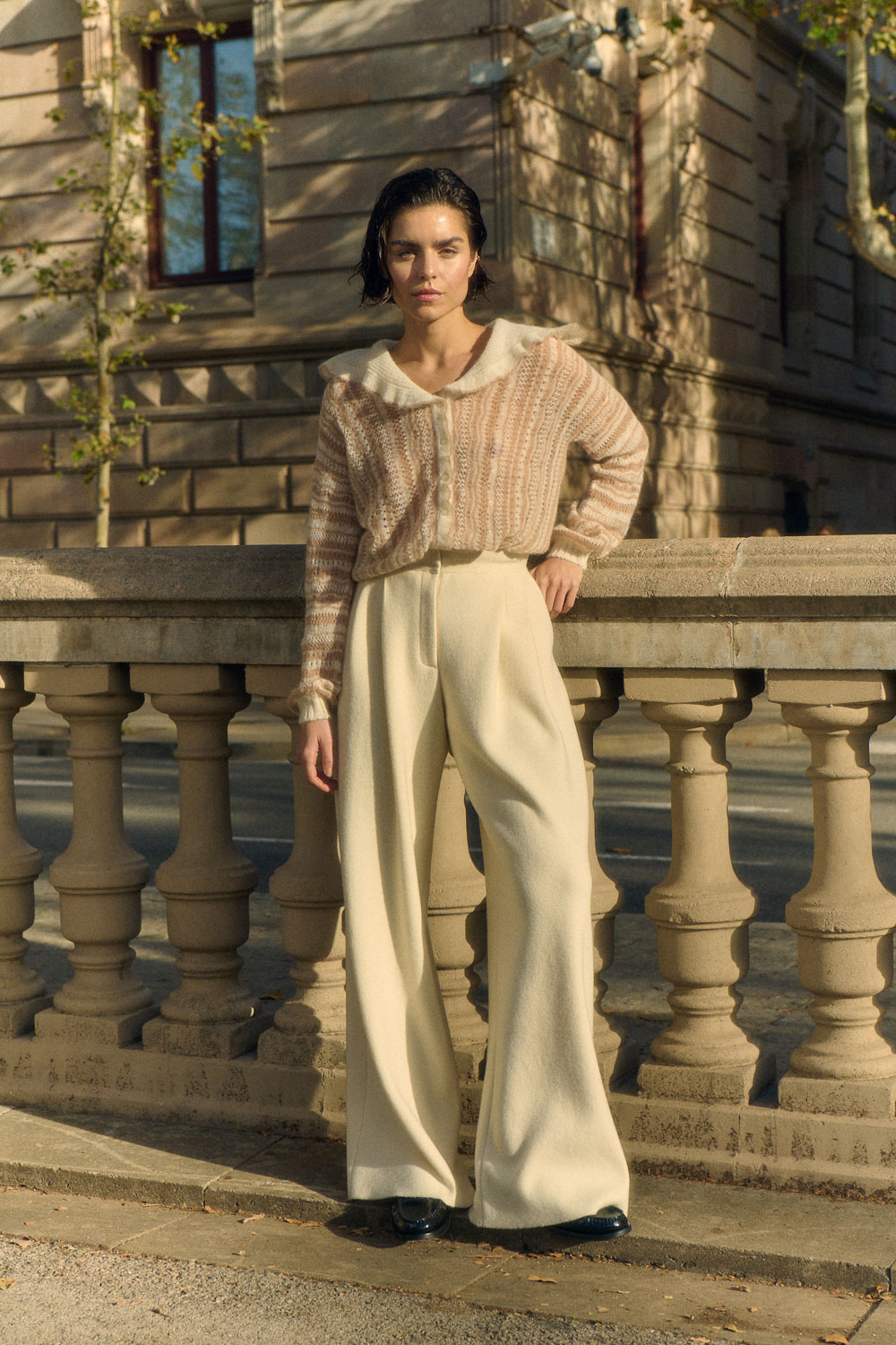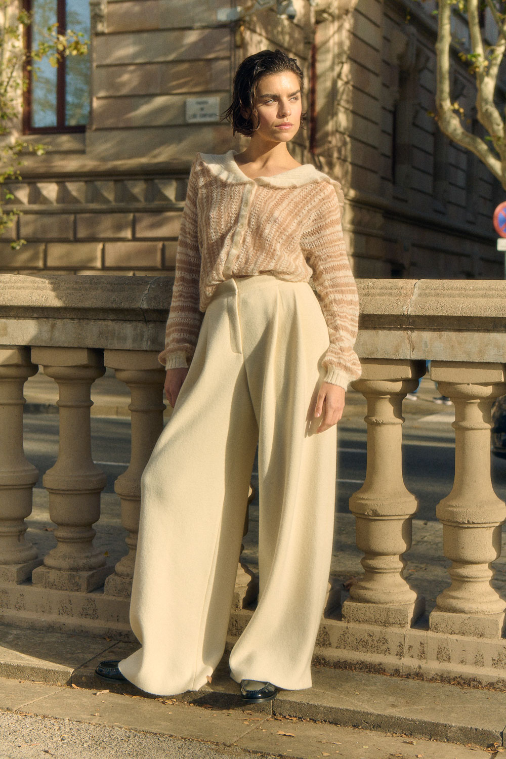 Pantalón de punto con doble pinza en la parte delantera y pernera ancha. Tejido en galga 12.