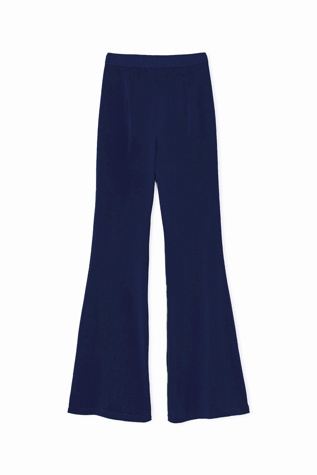 Descripcion: 94% POLIESTER 6% ELASTANO. Pantalón de tiro alto confeccionado en punto con un tejido cómodo, elástico en la cintura y bajos acampanados.