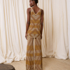 DESCRIPCIÓN: Top con escote en pico tanto en la parte delantera como en la espalda, realizado en intarsia con dibujo geométrico en tonos dorado y marrón. COMPOSICIÓN: 87% Viscosa, 13% Hilo Metalizado