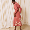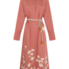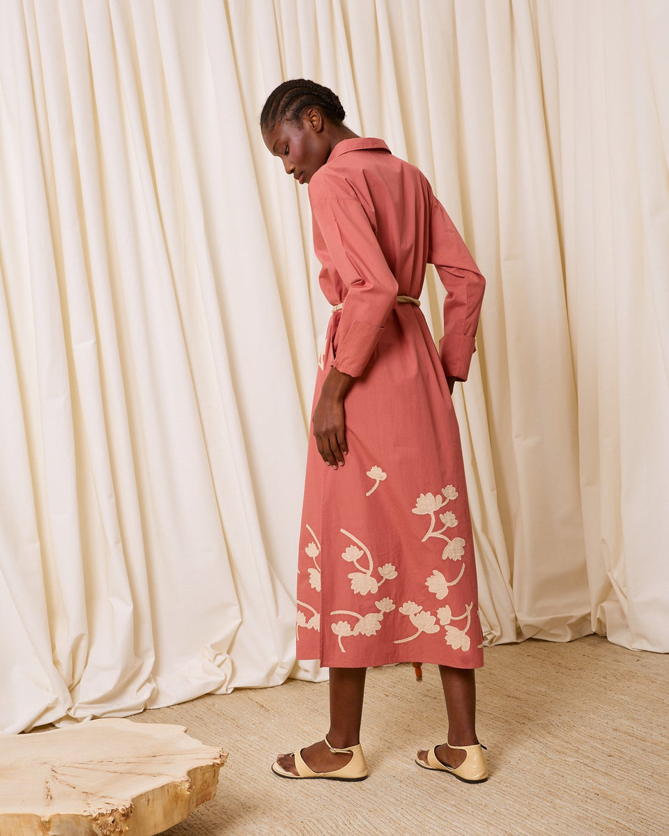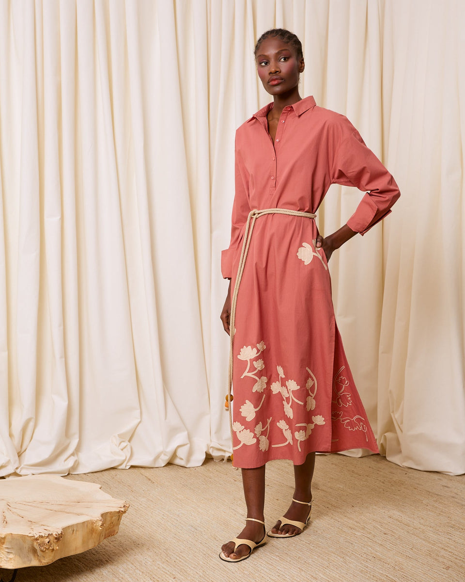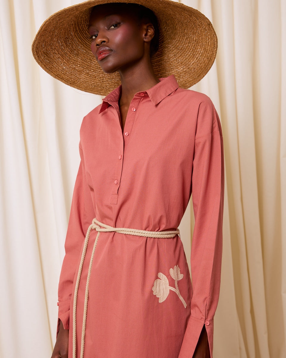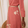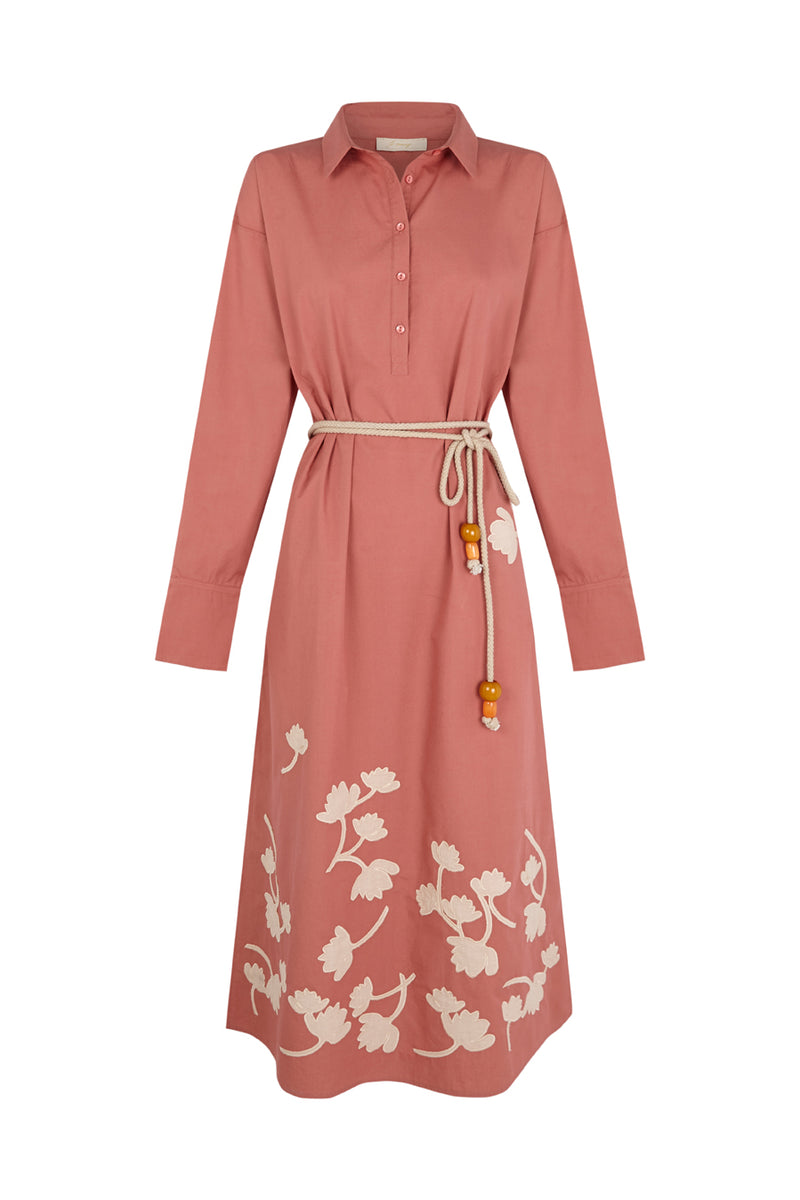 DESCRIPCIÓN: Vestido camisero de algodón en color rosa coral, con manga larga. Flores de algodón recortadas y cosidas en la falda en color crudo. Incluye cuerda gruesa con bolitas de adorno en los extremos para anudar a modo de cinturón. COMPOSICIÓN: 100% Algodón