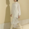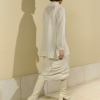Vestido de punto menguado de dos piezas. Vestido interior de rayón viscosa 100% con tirantes anchos y escote delante y detrás. Sobre él, jersey oversize de cuello alto en punto liso suave y tejido abierto, que crea transparencias y puños abullonados. Hecho en Igualada con hilo de origen italiano. Composición: Made in Igualada 53% Alpaca – 33% Poliamida – 14% Lana Virgen