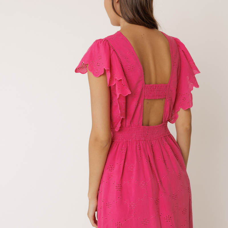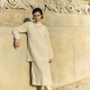 Vestido de punto menguado de dos piezas. Vestido interior de rayón viscosa 100% con tirantes anchos y escote delante y detrás. Sobre él, jersey oversize de cuello alto en punto liso suave y tejido abierto, que crea transparencias y puños abullonados. Hecho en Igualada con hilo de origen italiano. Composición: Made in Igualada 53% Alpaca – 33% Poliamida – 14% Lana Virgen.