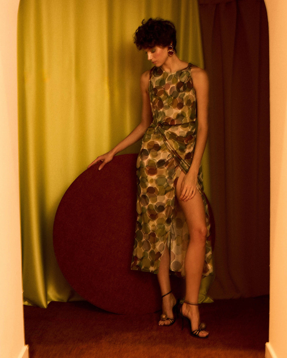 100% Poliéster. Vestido estilo midi de tul con estampado de círculos en colores verdes, azul y granate con apliques bordados localizados. Con escote cerrado y detalle en tirante girado. Con un frunce lateral en cintura y abertura ligera al andar